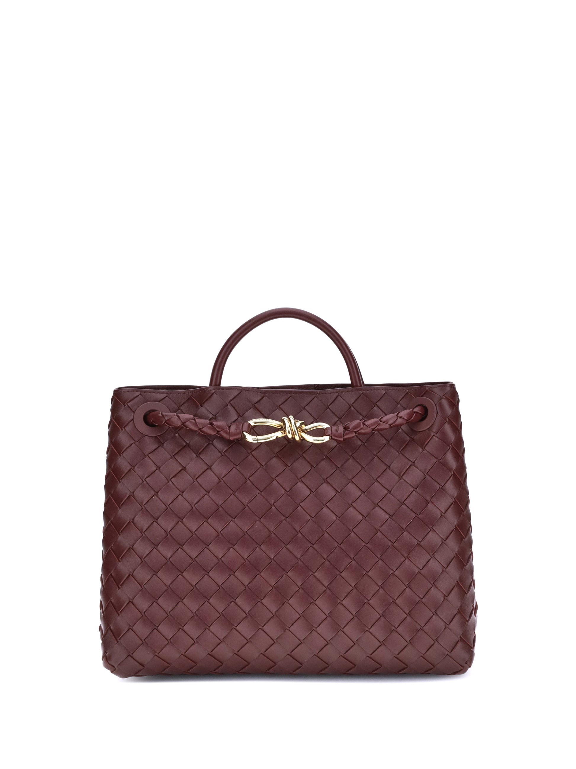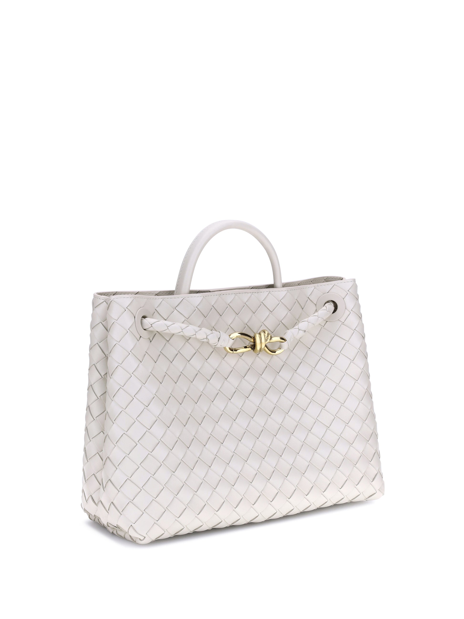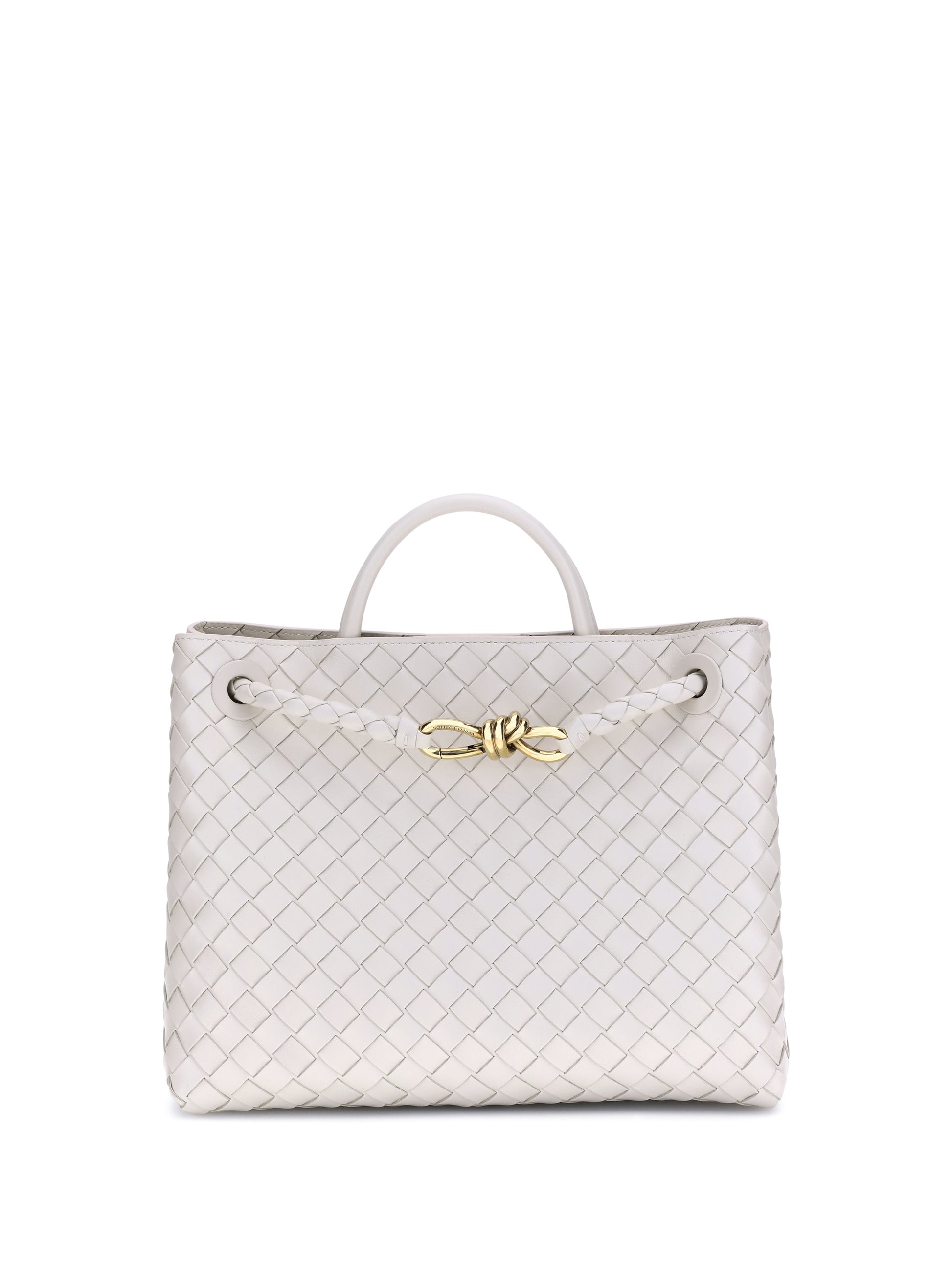 The Andiamo Shoulder Bag by Bottega Veneta in lambskin features a single, stiff top handle for an elegant grip. The slim sliding shoulder strap is embellished with the iconic antique brass knotted detail on the front. The design features the brand's iconic all-over repeated weave. Inside, the bag offers a single interior compartment, ideal for simple and elegant organization.