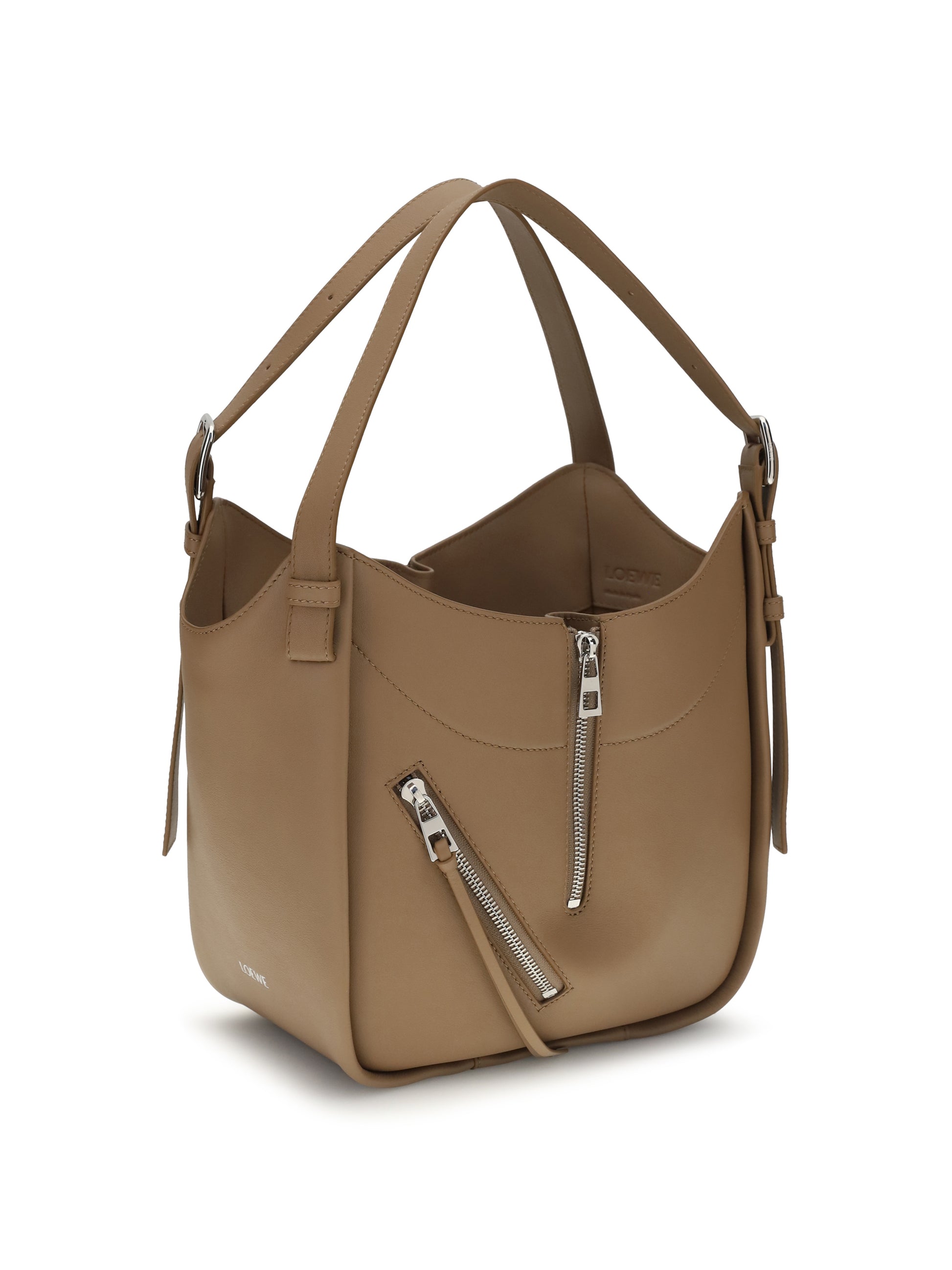 The Hammock Flip leather Handbag by Loewe is an elegant and versatile accessory designed to be worn on the shoulder, across the body, or carried by hand. Featuring an adjustable and removable shoulder strap, it has a practical magnetic closure. The functional design includes an external zip pocket and two internal open pockets, while the herringbone cotton canvas lining and gold or silver embossed LOEWE logo complete the bag's refined and contemporary aesthetic.